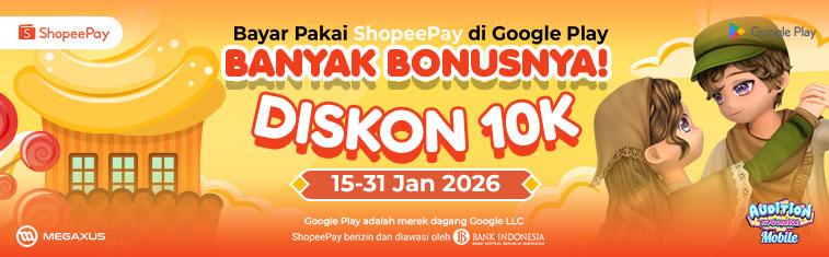 Hai Dancer~.Ada info terbaru nih untuk kamu gamer AyoDance Mobile, Megaxus dan ShopeePay akan memberikan diskon 10k untuk setiap transaksi yang berlangsung di dalam game AyoDance Mobile dengan memilih pembayaran menggunakan ShopeePay di Google Play..Kamu bakalan mendapatkan diskon Rp 10.000 di Shope...